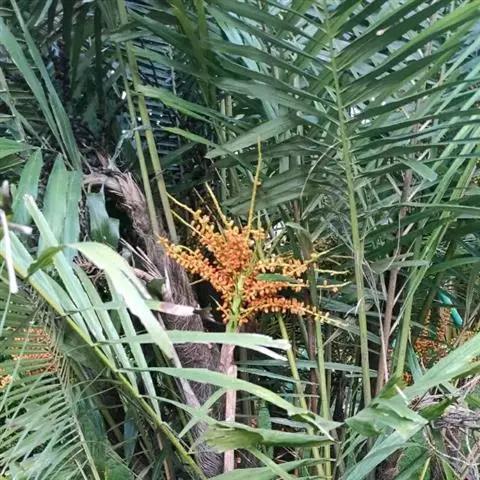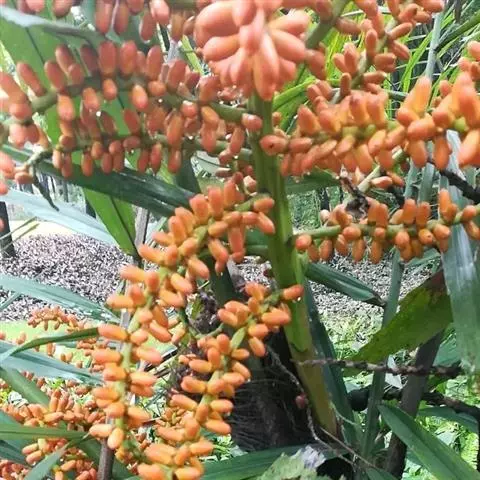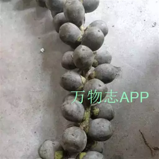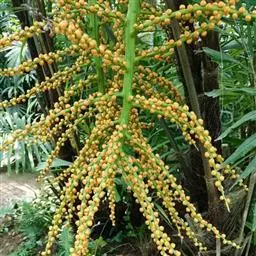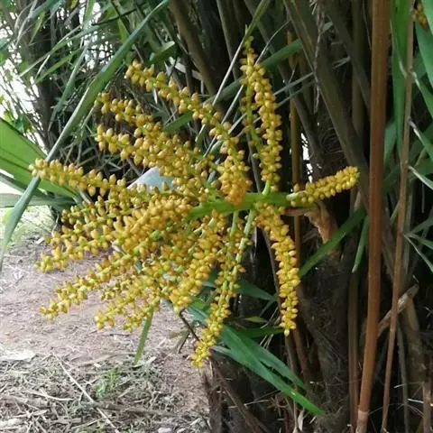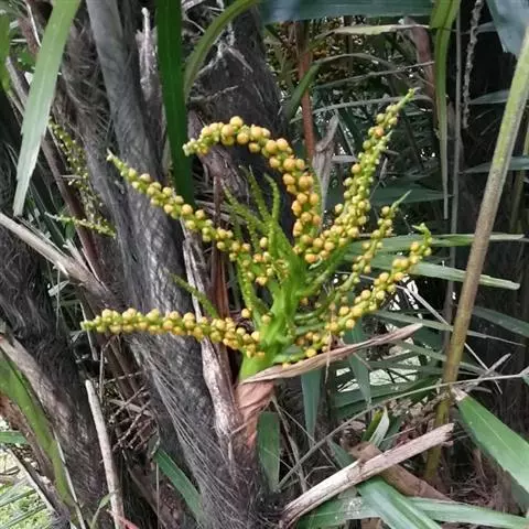 花序腋生,从上部往下部抽生几个花序,当最下部的花序的果实成熟时,植株即死亡;花序长90-150厘米,花序梗粗壮,下弯,分枝多,长达1.5米,佛焰苞多个,螺旋状排列于花序梗上;雄花大,长1.5-2厘米,花萼、花瓣各3片,雄蕊多达100枚以上;雌花花萼及花瓣各3片,花后膨大。果实近球形,直径4-5厘米,具三棱,顶端凹陷,灰褐色(未熟果实干后呈黑色)。种子3颗,黑色,卵状三棱形, 悬胚乳均匀,胚背生。花期6月,果实约在开花后2-3年时间成熟。