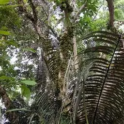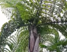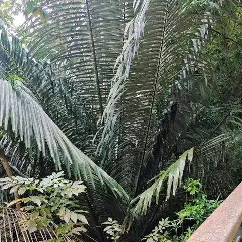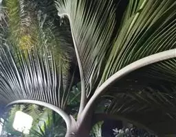 桄榔 乔木状,茎较粗壮,高5米至10余米,直径15-30厘米,有疏离的环状叶痕。叶簇生于茎顶,长5-6米或更长,羽状全裂,羽片呈2列排列,线形或线状披针形,长80-150厘米,宽2.5-6.5厘米或更宽,基部两侧常有不均等的耳垂,顶端呈不整齐的啮蚀状齿或2裂,上面绿色,背面苍白色;叶鞘具黑色强壮的网状纤维和针刺状纤维。