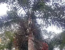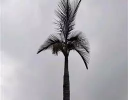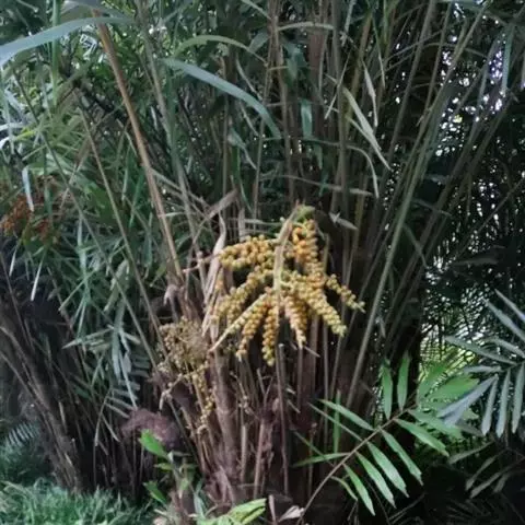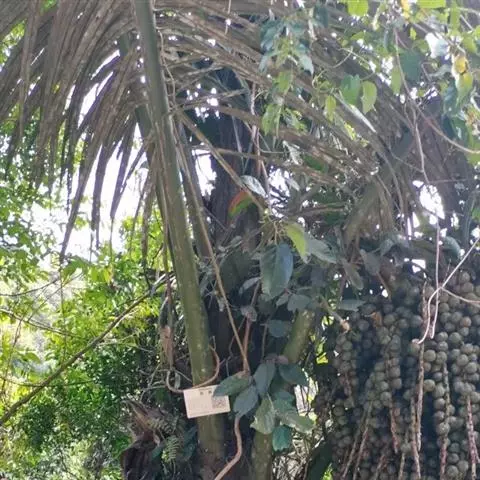 桄榔(学名:Arenga pinnata (Wurmb.) Merr. )是棕榈科,桄榔属乔木状植物,茎较粗壮,高可达10米,有疏离的环状叶痕。叶簇生于茎顶,羽状全裂,羽片线形或线状披针形,基部两侧常有不均等的耳垂,上面绿色,背面苍白色;花序腋生,花序梗粗壮,下弯,分枝多,佛焰苞多个,螺旋状排列于花序梗上;雄花大,果实近球形,具三棱,种子黑色,卵状三棱形,6月开花,果实约在开花后2-3年时间成熟。