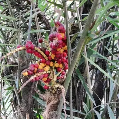 种子处理:桄榔树果实成熟不一致,每年从夏到冬均有成熟,桄榔树果穗有果实数百颗,每颗有种子1-2粒,核果球形或椭圆形。果实成熟时果皮蜡质,暗红色,剖开果实见种子呈暗褐色,此时可采种。种子处理方法有两种:一是将果实堆沤数日,待果皮腐烂后置水中搅拌,洗净种子;二是将果实摊放于通风处,当果皮干缩开裂后剥出种子。