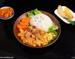 白米饭上盖上黄豆芽等蔬菜,肉和鸡蛋等佐料,盛在滚烫的石碗内,加放适量的辣椒酱后,搅拌而食,这就是韩国料理中的石锅拌饭。拌饭的佐料很关键,蔬菜最好选用嫩豆芽、芹菜、红萝卜丝、蘑菇丝,用油和黑胡椒粉炒熟;荤的选用酱料炒好的肉末。白米饭煮熟后,放入石锅前,在石锅底部及边缘涂抹一层香油,其作用是不使米饭粘锅,同时增加了油香的味道。把石锅放在炉子上,炉子要开最小的火,然后把各种蔬菜佐料放在米饭上面,最后撒点芝麻,淋香油。煎鸡蛋时蛋黄完整而表面凝结,使其脱离蛋清而不破裂,不能煎太熟。把煎好的鸡蛋铺在石锅饭上面。石锅放入米饭后,铺上与之相拌的蔬菜、肉末与鸡蛋,加热后当香油 “嗞嗞”作响时端下,浓香四溢。