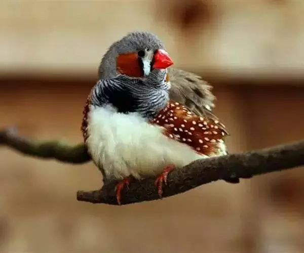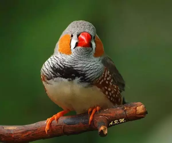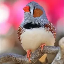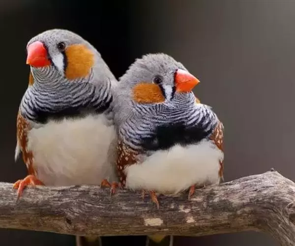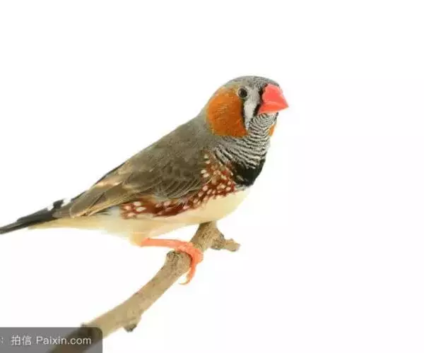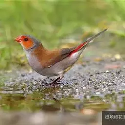 橙颊梅花雀体长约10厘米,头部灰色,两侧有大块橙色区域,嘴基及眼下方有黑纹,两条黑纹间呈白色,…