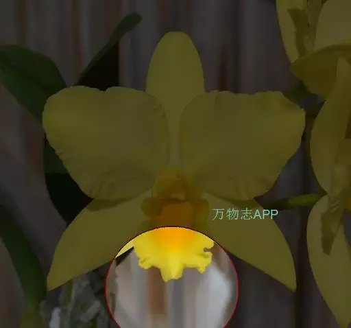 花瓣倒卵形,等长于中萼片,宽约为萼片的2倍,先端近圆形,具约10条脉;唇瓣的颜色比萼片和花瓣深,近肾状圆形,长约2厘米,宽2.3厘米,先端浅2裂,基部两侧多少具红色条纹,边缘波状,上面密被短绒毛;唇盘通常呈“∧”隆起,有时具“U”形的栗色斑块;蕊柱长约5毫米;药帽淡黄色,尖塔状。花期3-5月。
