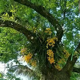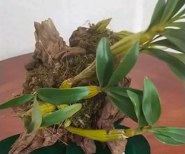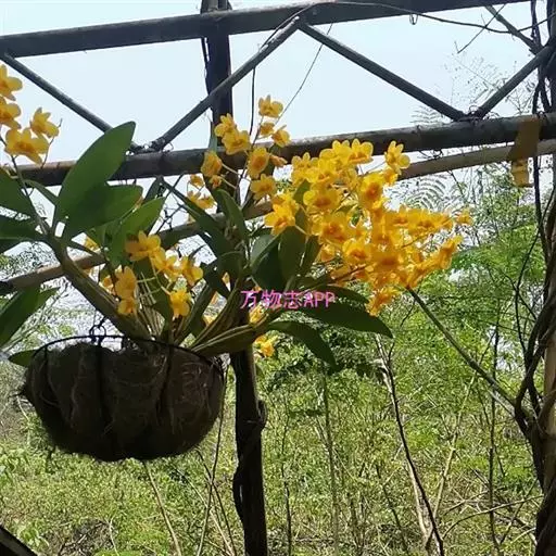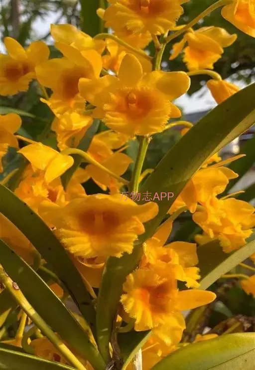 鼓槌石斛(学名:Dendrobium chrysotoxum Lindl.):茎直立,肉质,纺锤形,具2-5节间,具多数圆钝的条棱,近顶端具2-5枚叶。叶革质,长圆形。总状花序近茎顶端发出,斜出或稍下垂,长达20厘米;花质地厚,金黄色,稍带香气;花瓣倒卵形,等长于中萼片,宽约为萼片的2倍,先端近圆形,具约10条脉;唇瓣的颜色比萼片和花瓣深,近肾状圆形。花期3-5月。
