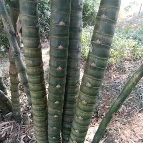 乔木状竹类植物,地下茎合轴型。 竿高8-10米,直径3-5厘米,尾梢弯垂,下部挺直;节间长40-70厘米,绿色,幼时被白蜡粉,并贴生或疏或密的淡棕色刺毛,以后变为无毛,竿壁薄(2-5毫米);节处平坦,无毛;分枝常自竿中下部第七节至第十一节开始,以数枝乃至多枝簇生,中央1枝略微较粗长。