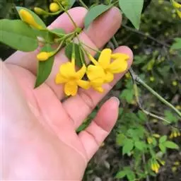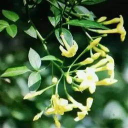 云南黄素馨,又叫云南迎春,常绿藤状灌木。小枝无毛,四方形,具浅棱。叶片对生,小叶3枚,长椭圆状披针形,顶端1枚较大,基部渐狭呈一短柄,侧生2枚小而无柄。花单生,淡黄色,具暗色斑点,花瓣较花筒长,常近于复瓣,有香气。花期3~4月。原产云南,现各地均有栽培。