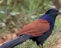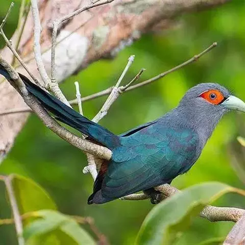 绿嘴地鹃:体形似小鸦鹃,但羽色大致绿灰;嘴绿色,头侧眼的周围有一裸区;后爪弯曲。虹膜赤红色,…