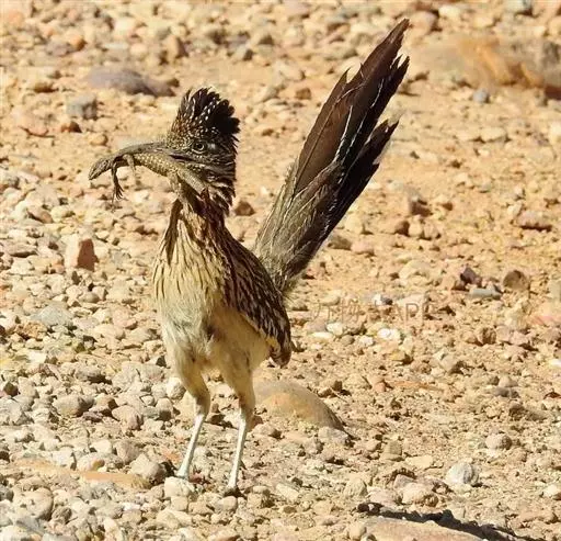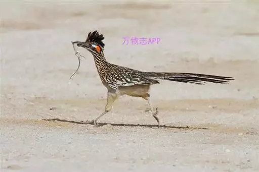 走鹃(road runner)鸟,英文名称字意为在路上赛跑者,亦称灌丛鸡(chaparralcock)。两种地栖杜鹃的统称,尤指美国西南部和墨西哥荒漠区的加州走鹃(Geococcyxcalifornianus)。体长约56公分(22寸)。羽衣橄榄褐和白色相间,有条纹。羽冠短而蓬松。眼後皮肤裸露,蓝红相间。腿粗壮,浅蓝色。尾长,凸形,向上翘。飞行笨拙且易疲乏。通常喜沿着道路跑或串行於灌木蒿和牧豆树的灌丛中,捕食昆虫、蜥蜴和蛇。捕到爬虫类後,用结实的喙将其啄死,然後从头部开始吞下。每窝产卵2∼12枚(通常3∼5枚),卵白色。营巢於仙人掌或小树下层,巢结实,由树枝构成。小走鹃(G.velox)稍小,长46公分(18寸);羽毛稍呈淡黄色,条纹较少。