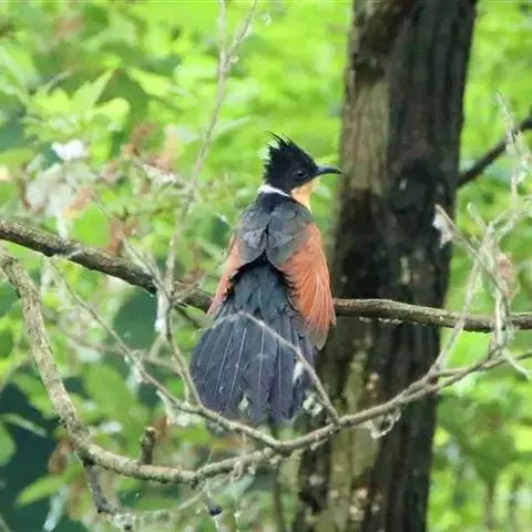 斑翅凤头鹃: 成鸟具羽冠,上体及头侧、翅、尾等黑色,具铁绿色亮辉,尾羽端部具白斑,两侧者形宽,…