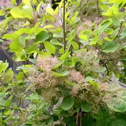 • 粉背黄栌叶卵圆形,较大,长3.5-10厘米,宽2.5-7.5厘米,无毛,但叶背显著被白粉;叶柄较长,…