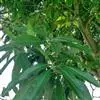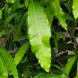 芒果 常绿大乔木,高10-20米;树皮灰褐色,小枝褐色,无毛。叶薄革质,常集生枝顶,叶形和大小变化较大,通常为长圆形或长圆状披针形,长12-30厘米,宽3.5-6.5厘米,先端渐尖、长渐尖或急尖,基部楔形或近圆形,边缘皱波状,无毛,叶面略具光泽,侧脉20-25对,斜升,两面突起,网脉不显,叶柄长2-6厘米,上面具槽,基部膨大。