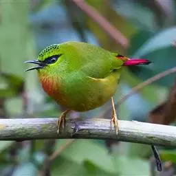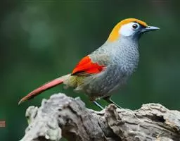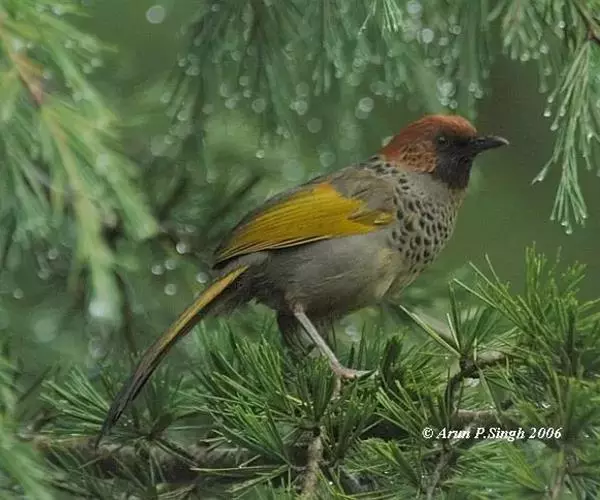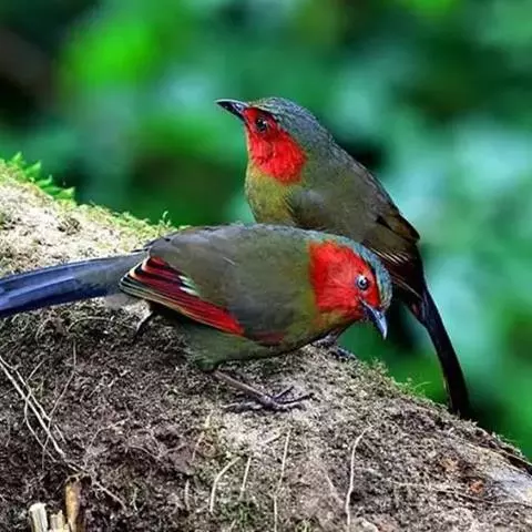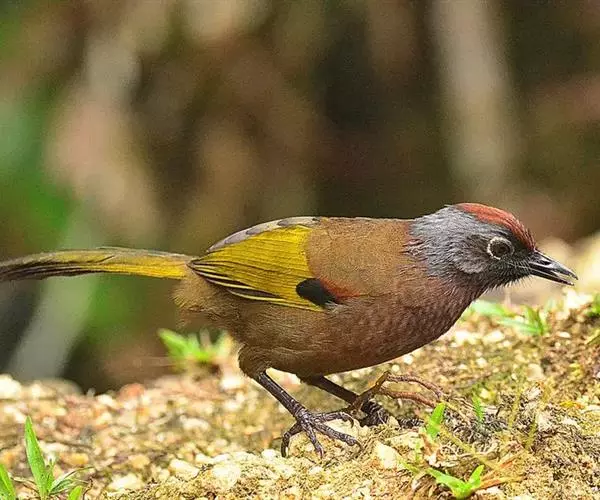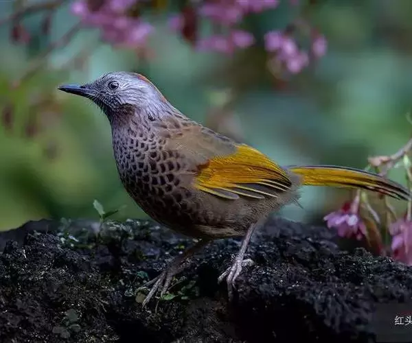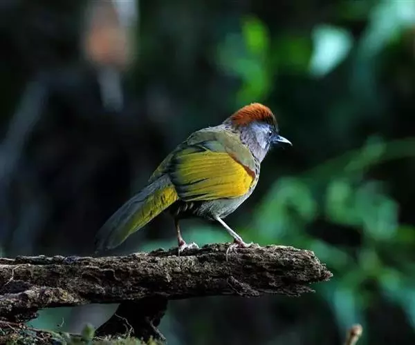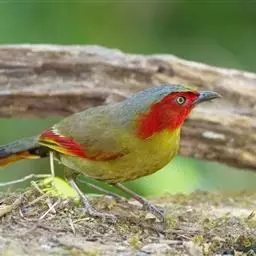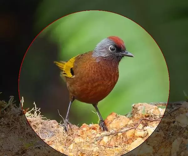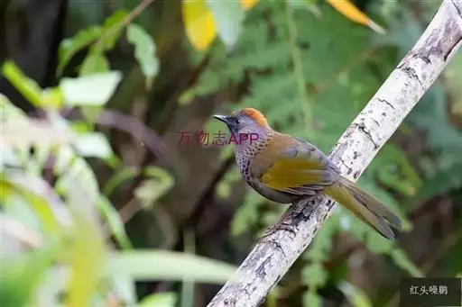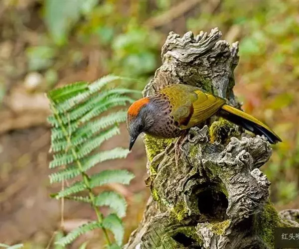 红头噪鹛(学名:Garrulax erythrocephalus)中型鸟类,体长22~28厘米。头顶棕红色,眼先、脸、颏、喉黑色,上体橄榄色或棕橄榄褐色,外侧飞羽金黄色,尾羽基部亦为金黄色,下体多为暗橄榄褐色。