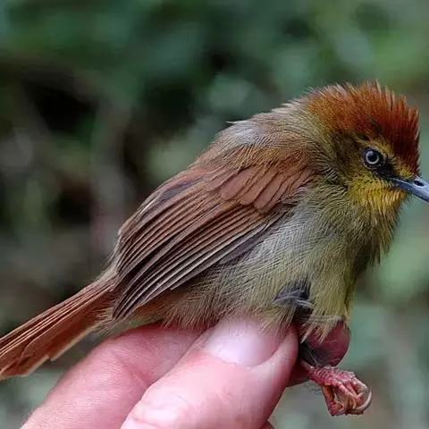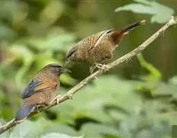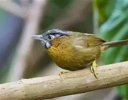 黑顶噪鹛:中型鸟类,体长24-26厘米。前额、脸、颏、喉黑色,头顶黑褐沾棕或深棕橄榄褐色,…