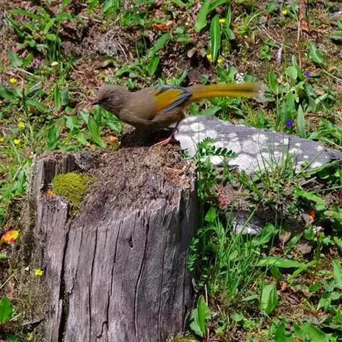 该种和赤尾噪鹛较为相似,但赤尾噪眉飞羽和尾羽为鲜红色,可明显与之区别。