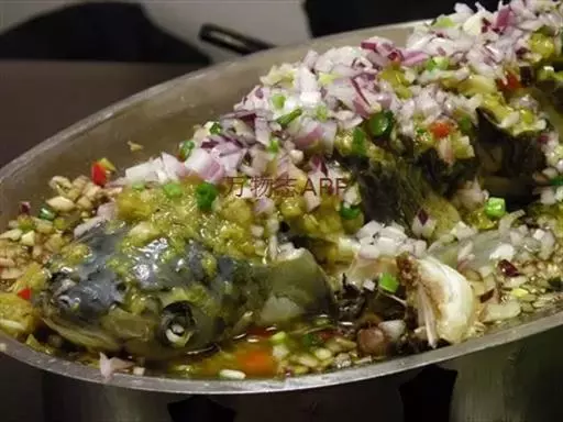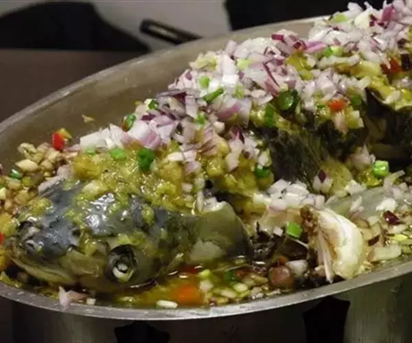 清蒸过江鱼是一道美食,由活鲤鱼、葱等原料做成。