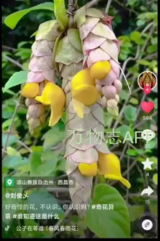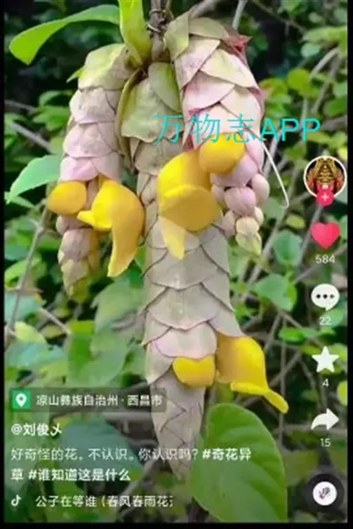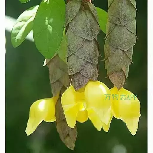 总状花序顶生,悬垂性,花冠2唇形,两侧对称,褐紫色叶状苞片;小花长5.5公分,外部被毛,上部特别阔 大,下部狭细管状,冠端4裂,有1片比较大,其它3片小形,,叶状苞片生于花的顶部,阔卵、卵或是倒卵形,苞端钝,脉纹显著,长4公分、宽3公分;绿色花萼杯形,先端截形或边缘具有4~5浅齿,外侧常会具有2~4粒大型腺体。