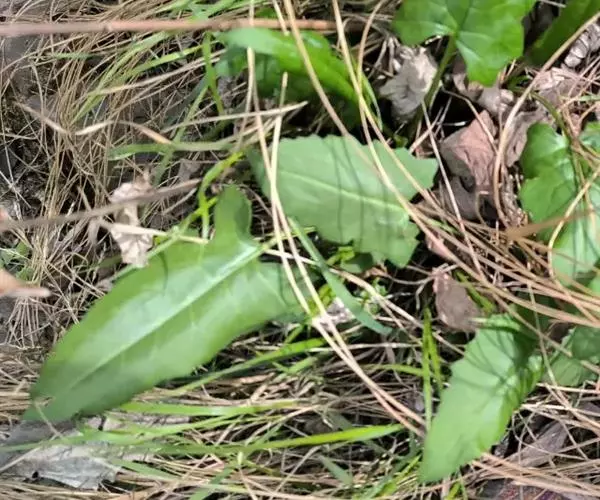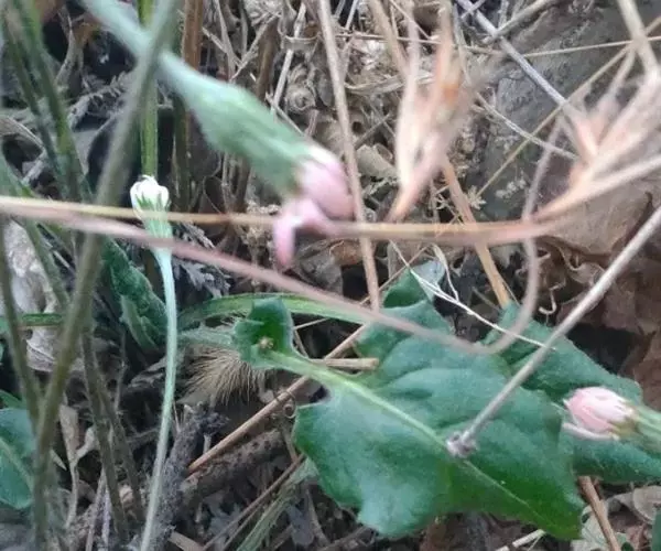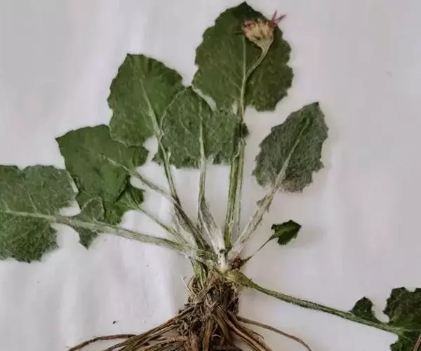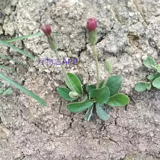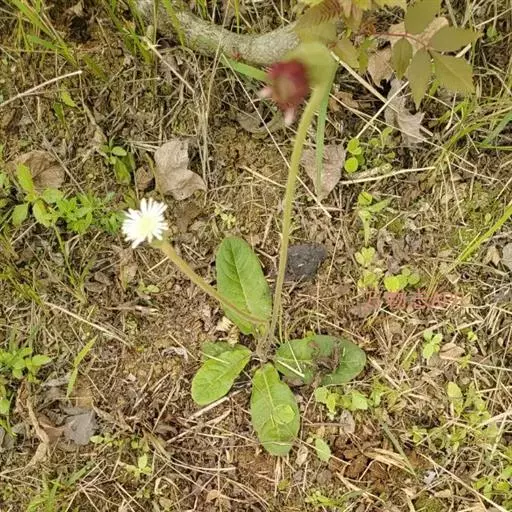 头状花序单生于花葶之顶,倒锥形,直径10-15毫米;总苞略短于冠毛;总苞片约3层,外层线形,长约4毫米,内层长,线状披针形,长达8毫米,二者顶端均钝,且带紫红色,背部被绵毛;花托平,无毛,直径3-4毫米;雌花花冠舌状,长10-12毫米,舌片长圆形,长6-8毫米,顶端具不整齐的3齿或有时钝圆,带紫红色,内2裂丝状,长1.5-2毫米,花冠管纤细,长3-4毫米,无退化雄蕊。两性花花冠管状二唇形,长6-8厘米,外唇阔,长约3毫米,顶端具3齿,内唇2裂丝状,长2.5-3毫米;花药顶端圆,基部具尖的尾部;花柱分枝长约1毫米,内侧扁,顶端钝圆。瘦果纺锤形,具纵棱,被白色粗毛,长5-6毫米;冠毛粗糙,污白色,长5-7毫米。秋型者植株较高,花葶长可达30厘米,叶片大,长8-15厘米,宽4-6.5厘米,头状花序外层雌花管状二唇形,无舌片。花期春、秋二季。