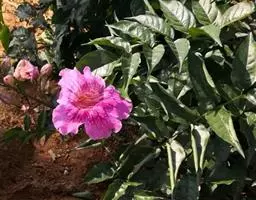 粉花凌霄 K.Schum.)是紫葳科魔盒凌霄属的落叶藤本植物。奇数羽状复叶对生,小叶全缘,…