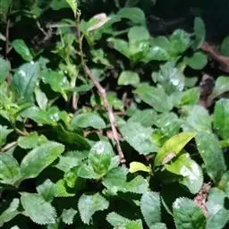 叶仅下部者有短柄;叶片三角状卵形、卵形或矩圆形,长4-20毫米,宽7-12毫米,顶端圆钝或急尖,基部截形或近心形,边缘有不明显的浅圆齿,侧脉3-4对,约以45度角伸展,上下两面均无毛。