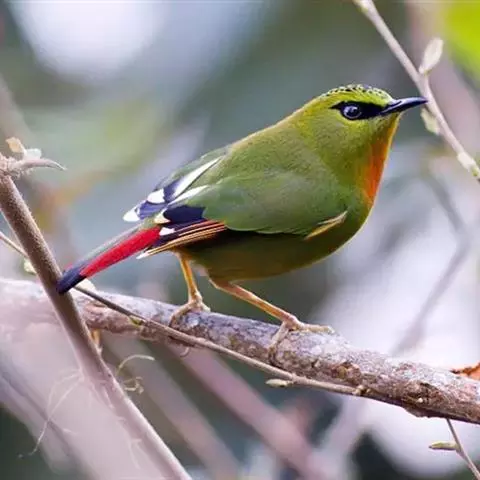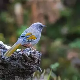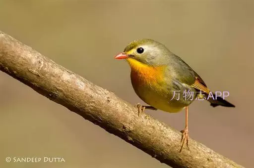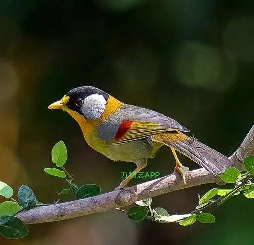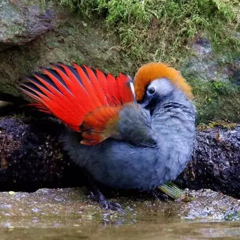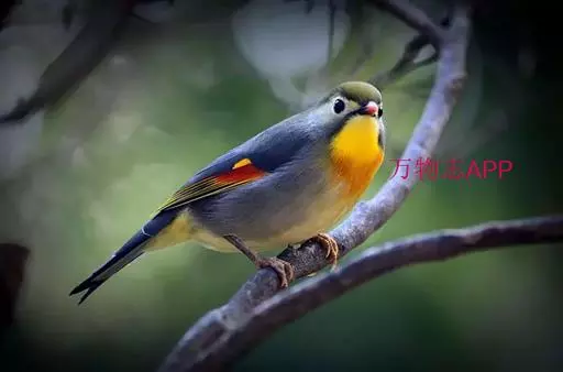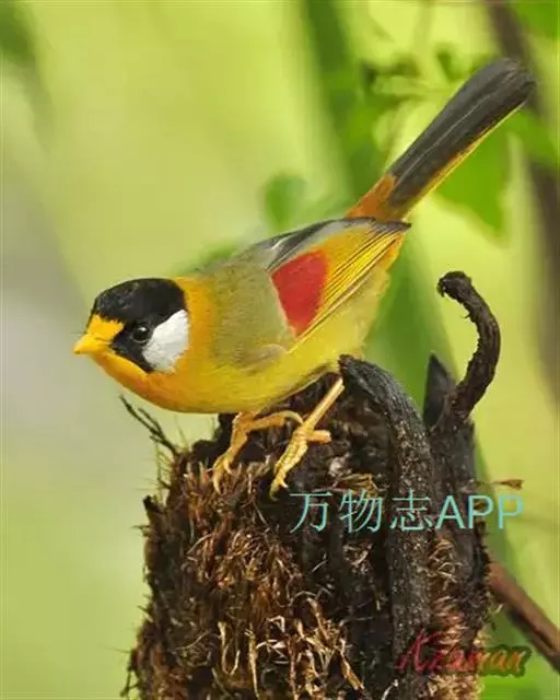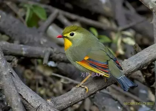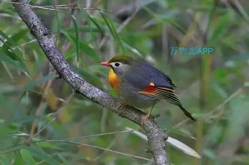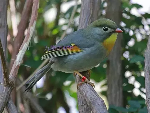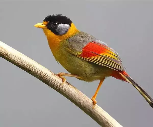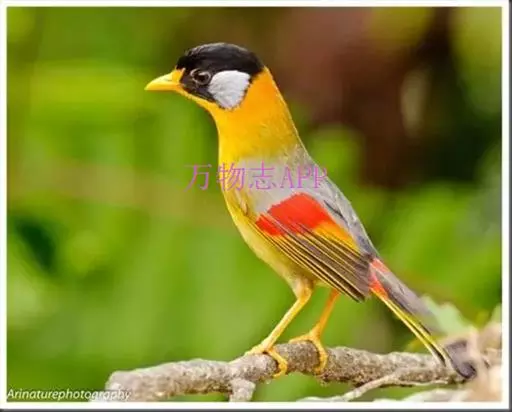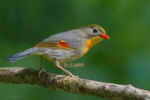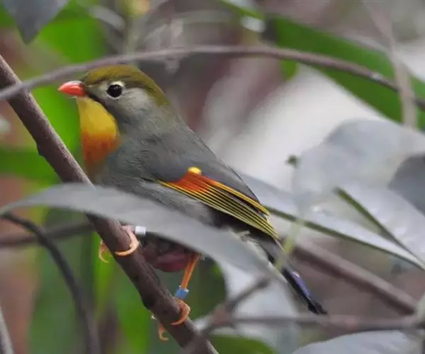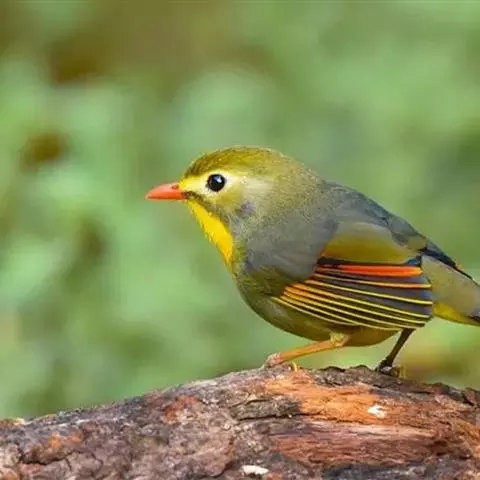 银耳相思鸟(学名:Leiothrix argentauris)小型鸟类,体长14~18厘米。头顶黑色,耳羽银灰色,前额橙黄色;外侧飞羽橙黄色,基部朱红色,极为鲜艳、醒目。尾圆形,尾上、尾下覆羽朱红色,尾暗灰褐色,外侧尾羽橙黄色,其余上体橄榄绿或橄榄黄色。喉、胸朱红色或黄色,嘴橙黄色。相似种红嘴相思鸟嘴为红色,头顶绿褐色,耳羽浅灰色,尾呈叉状,黑色。区别明显,野外不难识别。