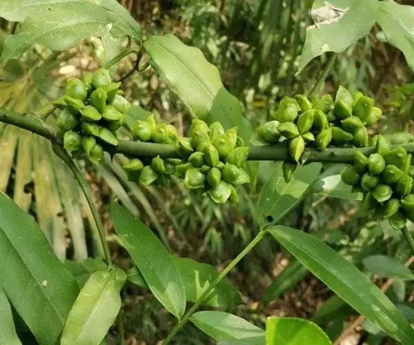 小叶狭长的带状披针形,长10-20厘米,宽1-2厘米,两端尖,叶缘浅波浪状,侧脉疏离。花期11-12月。