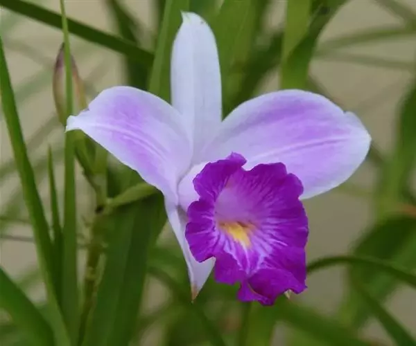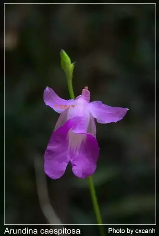 竹叶兰(学名:Arundina graminifolia (D. Don) Hochr.):草本植物。植株高40-80厘米,有时可达1米以上;地下根状茎常在连接茎基部处呈卵球形膨大,貌似假鳞茎,直径1-2厘米,具较多的纤维根。茎直立,常数个丛生或成片生长,圆柱形,细竹秆状,通常为叶鞘所包,具多枚叶。叶线状披针形,薄革质或坚纸质。花序通常长2-8厘米,总状或基部有1-2个分枝而成圆锥状,具2-10朵花;花粉红色或略带紫色或白色;花瓣椭圆形或卵状椭圆形,与萼片近等长。花果期为9-11月或1-4月。