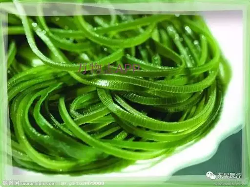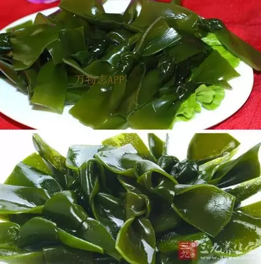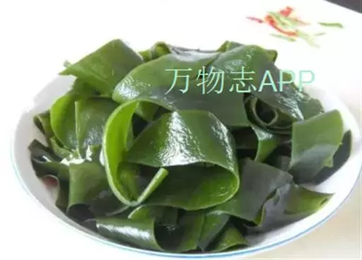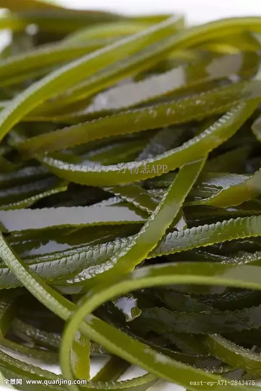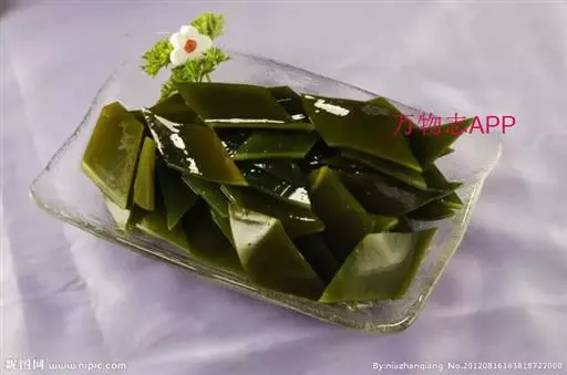 【成分】鲜品可食用部分100%。每100g中含能量70kJ、水分94.4g,蛋白质1.2g,脂肪0.1g,膳食纤维0.5g,碳水化合物1.6g,硫胺素0.02mg、核黄素0.15mg,尼克酸1.3mg:维生素E 1.85mg;钾246mg,钠8.6mg,钙46mg,碘0.28mg,镁25mg、铁0.9mg,锰0. 07mg、锌0.16mg,磷22mg、硒9.54μg。维生素C未检出。尚含藻胶酸(高达32%)和昆布素等。