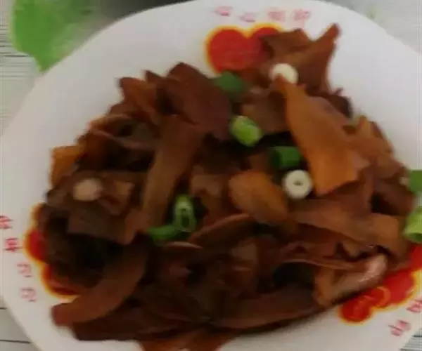 (5)在炒的肉里放香菇﹑石耳﹑青椒炒后﹐放在冲白面的水里煮熟﹐并与炒好的竹笋混在一起盛在碗里。