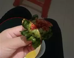 5、尝咸淡,加盐及白糖合味,再煨片刻装盘,注意用筷子理顺,并把辣椒夹出去。
