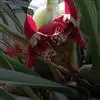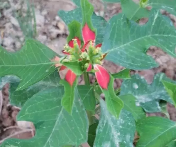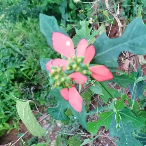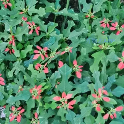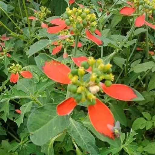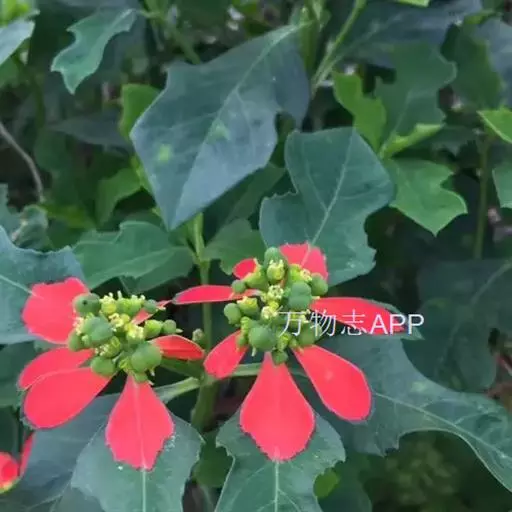 猩猩草(学名:Euphorbia cyathophora Murr.):常绿或半常绿灌木,盆栽时株高0.5米-2米,在亚热带地区可长到6米以上。茎直立而光滑,单叶互生,卵状椭圆形至阔披针形,具不规则的深缺刻。长10-15厘米。花小,有蜜腺,排列成密集的伞房花序。总苞形似叶片,也叫顶叶,基部大红色,也有半边红色半边绿色的。上面簇生出红色的苞片,向四周放射而出,苞片和叶片相似,只是较狭,是主要观赏部位。雌雄同株异花,雌花单生于花序的中央,雄花多数,均无花被。蒴果扁圆形。种子卵圆形,黑色。