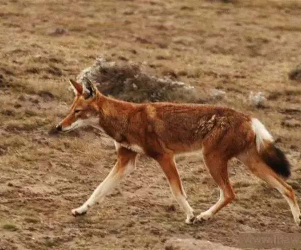 埃塞俄比亚狼(学名:Canis simensis):是一种小型犬。体重11.2-19.3千克,体长841-1012毫米。雄狼比雌狼大约20%。皮毛呈独特的红棕色。头颅骨扁平,颅盖骨呈圆柱状。牙齿细小及疏落,适合它们大量吃啮齿目的食性。面部、耳朵及背部呈赭黄色至銹红色,腹部呈白色至淡姜色。红色和白色皮毛之间的界限十分明显。面颊上有白色小点,眼下有弯月状的斑纹,下巴和喉咙也是白色的。