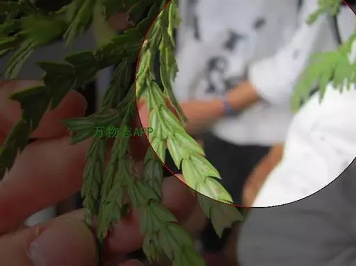 福建柏 乔木,高达17米;树皮紫褐色,平滑;生鳞叶的小枝扁平,排成一平面,二、三年生枝褐色,光滑,圆柱形。鳞叶2对交叉对生,成节状,生于幼树或萌芽枝上的中央之叶呈楔状倒披针形,通常长4-7毫米,宽1-1.2毫米,上面之叶蓝绿色,下面之叶中脉隆起,两侧具凹陷的白色气孔带,侧面之叶对折,近长椭圆形,多少斜展,较中央之叶为长,通常长5-10毫米,宽2-3毫米,背有棱脊,先端渐尖或微急尖,通常直而斜展,稀微向内曲,背侧面具1凹陷的白色气孔带;生于成龄树上之叶较小,两侧之叶长2-7毫米,先端稍内曲,急尖或微钝,常较中央的叶稍长或近于等长。雄球花近球形,长约4毫米。