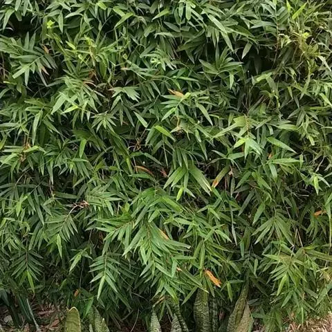 凤尾竹 Raeusch. ex Schult. ’Fernleaf’ R. A. Young)是禾本科,簕竹属孝顺竹的变种。植株较高大,杆高可达6米,竿中空,小枝稍下弯,下部挺直,绿色;竿壁稍薄;节处稍隆起,无毛;叶鞘无毛,纵肋稍隆起,背部具脊;叶耳肾形,边缘具波曲状细长繸毛;叶舌圆拱形,叶片线形,上表面无毛,下表面粉绿而密被短柔毛,小穗含小花,中间小花为两性;外稃两侧稍不对称,长圆状披针形,先端急尖;内稃线形,脊上被短纤毛,花药紫色,子房卵球形,羽毛状。成熟颖果未见。原产中国,华东、华南、西南以至台湾、香港均有栽培。凤尾竹喜温暖、湿润和阳光充足的环境,耐寒。宜土层深厚、肥沃、疏松的微酸性壤土。该种观赏价值较高,宜作庭院丛栽,也可作盆景植物。全草或根入药,味淡、微苦,性寒,有清热利湿、凉血止血、消肿解毒功效,可治痢疾、泄泻等多种病症。凤尾