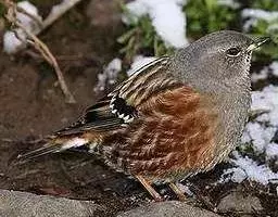 鸲岩鹨(学名:Prunella rubeculoides)是岩鹨科、岩鹨属小型鸟类,体长15-17厘米。头灰棕色,背、肩、腰棕褐色具黑色纵纹,两翅褐色,翅上有白色翅斑。颏、喉沙褐或灰色,胸锈棕色,在喉胸之间有一不明显的黑色颈圈,其余下体白色。特征明显,野外不难识别。虹膜褐色,嘴黑色,跗踱肉褐色。