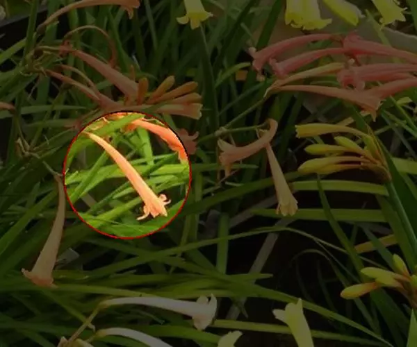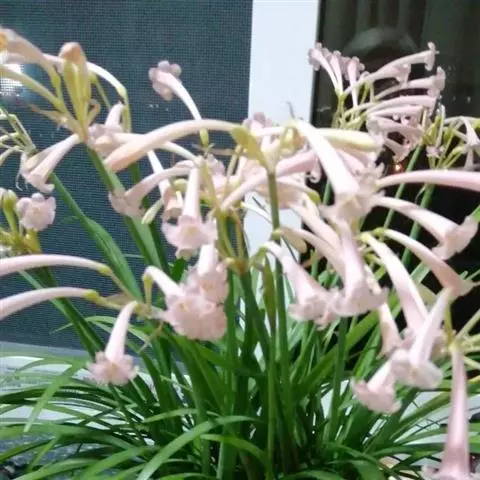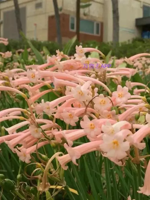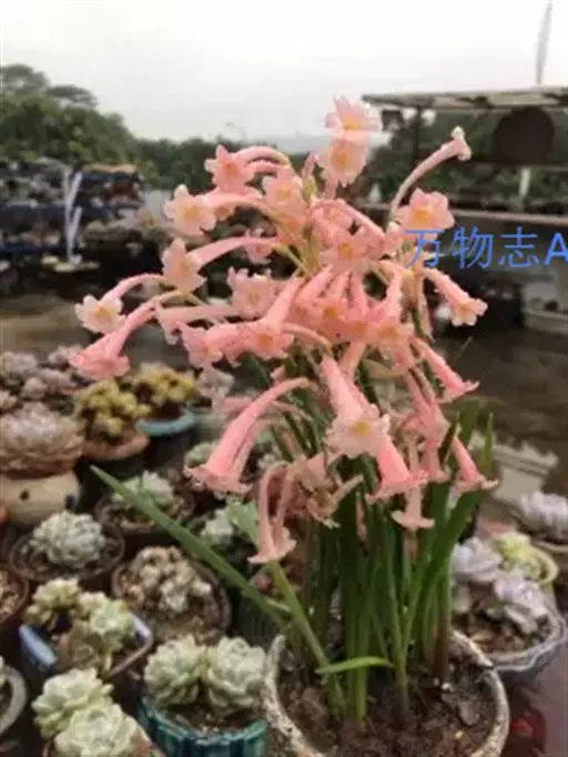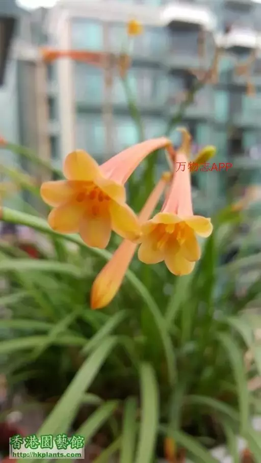 多年生常绿球根植物,株高约20~30cm,地下鳞茎球形。叶线形,绿色。花自地下鳞茎抽生而出,细长,花呈长筒状,略低垂,每个花枝着花8朵左右,有黄、橙红、白、粉红等色。