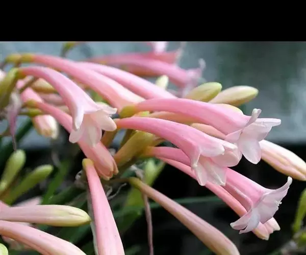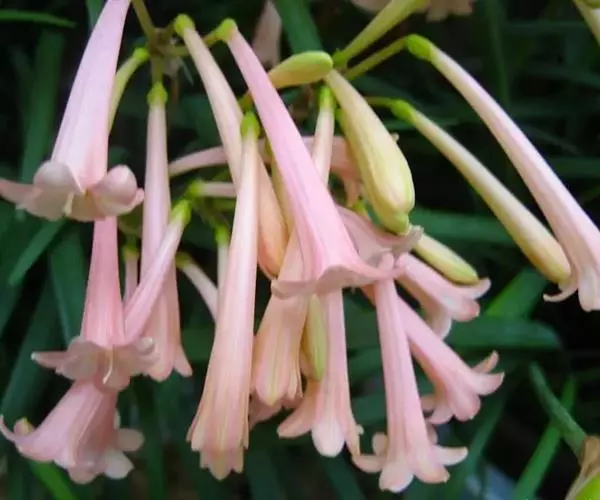 多年生常绿球根植物,株高约20~30cm,地下鳞茎球形。叶线形,绿色。花自地下鳞茎抽生而出,细长,花呈长筒状,略低垂,每个花枝着花8朵左右,有黄、橙红、白、粉红等色。花期冬春,果期春季。偶尔可以在花市看见垂筒花的切花供应,盆栽不多见。