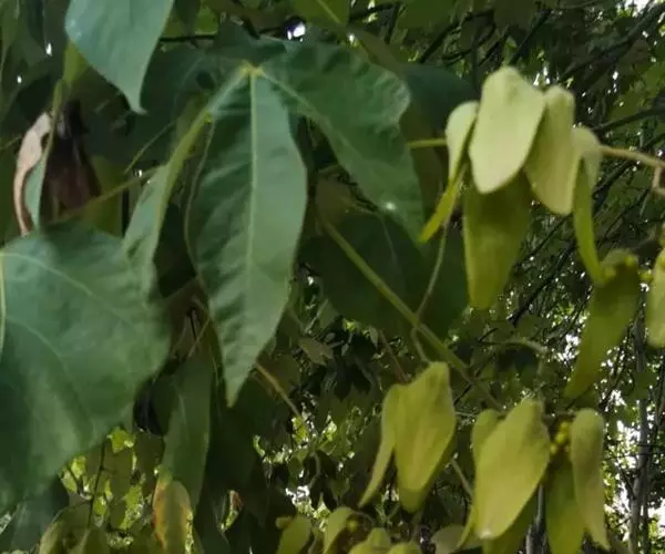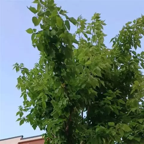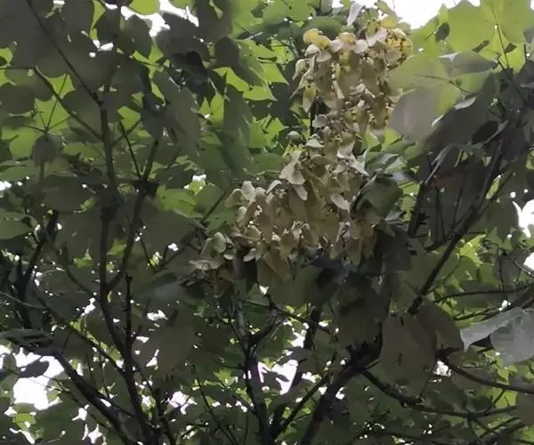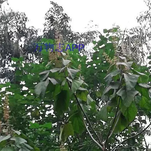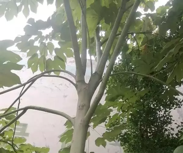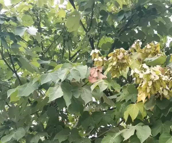 梧桐树是落叶乔木,高达15米;树叶青绿色,平滑。叶呈心形,掌状3~5裂,直径15~30厘米,裂片是三角 梧桐树(图2) 形,顶端渐尖,基部心形,两面均无毛或略披短柔毛,基生脉7条,叶柄与叶片等长。圆锥花序顶生,长约20~50厘米,下部分枝长达14厘米,花淡紫色;萼5深裂几至基部,萼片条形,向外卷曲,长7~9毫米,外面披淡黄色短柔毛,内面仅在基部披柔毛;花梗与花几等长;雄花的雌雄蕊柄与萼等长,下半部较粗,无毛,花药15个不规则地聚集在雌雄蕊柄顶端,退化子房梨形且甚小;雌花的子房圆球形,被毛覆盖。蓇葖果膜质,有柄,成熟前开裂成叶状,长6~11厘米、宽1.5~2.5厘米,外面短茸毛或几无毛,每蓇葖果有种子2~4个;种子圆球形,表面有皱纹,直径约6~7毫米。花期6月左右。