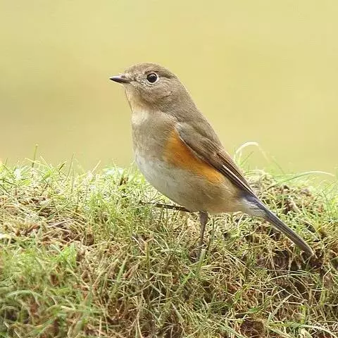 雌鸟上体橄榄褐色,头侧和颈侧沾灰,腰和尾上覆羽锈褐色,尾亦为锈褐色,翅上覆羽黑褐色,羽缘橄榄褐色,飞羽黑褐色,外翈羽缘浅锈褐色。颏、喉污白色,胸和两胁淡灰褐色或灰色,腹和尾下覆羽白色。
