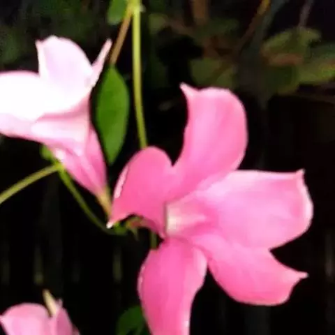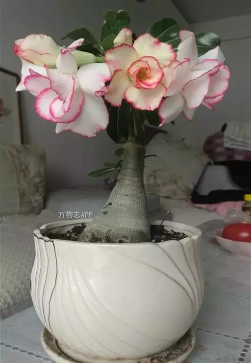 沙漠玫瑰花形似小喇叭,玫瑰红色,非常艳丽。伞形花序三五成丛,灿烂似锦,四季开花不断。因原产地接近沙漠且红如玫瑰而得名沙漠玫瑰。沙漠玫瑰单叶互生,倒卵形,顶端急尖,长8厘米~10厘米,宽2厘米~4厘米,革质,有光泽,腹面深绿色,背面灰绿色,全缘。总状花序,顶生,着花10多朵,喇叭状,长6厘米~8厘米;花冠5裂,有玫红、粉红、白色及复色等。5月~12月是沙漠玫瑰的花期,花有红、玫红、粉红、白等色。南方温室栽培较易结实。种子有白色柔毛,可助其飞行散布。