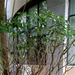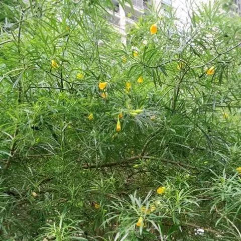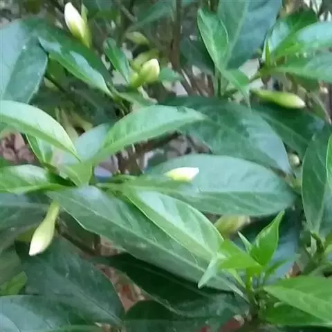 狗牙花 R. Br. ex Roem. & Schult.)是夹竹桃科山辣椒属灌木植物;枝灰绿色;叶椭圆形或椭圆状长圆形,叶面深绿色,背面淡绿色,叶面扁平;花聚伞花序腋生,通常双生,萼片长圆形,边缘有缘毛,花冠白色;果长圆形;花期六至十一月;果期秋季。狗牙花因其花冠裂片边缘有皱纹,状如狗牙,故名。狗牙花原产于印度及中国云南,在广西、广东、台湾及亚洲热带和亚热带等地区广泛栽培。狗牙花喜温暖湿润,不耐寒,宜半阴,对土壤要求不严,喜肥沃、排水良好的酸性土壤,常生长于山地灌木丛中。狗牙花的主要繁殖方式为扦插。狗牙花味酸、凉,有清热降压、解毒消肿的功效,可用于治疗咽喉肿痛,跌打损伤。狗牙花枝叶茂密,株型紧凑,花朵净白素丽,典雅朴质,盛花时十分美观,且花期长,具有一定观赏价值。狗牙花还有较高的经济价值,园林中应用极为普遍,可丛植于林缘、路