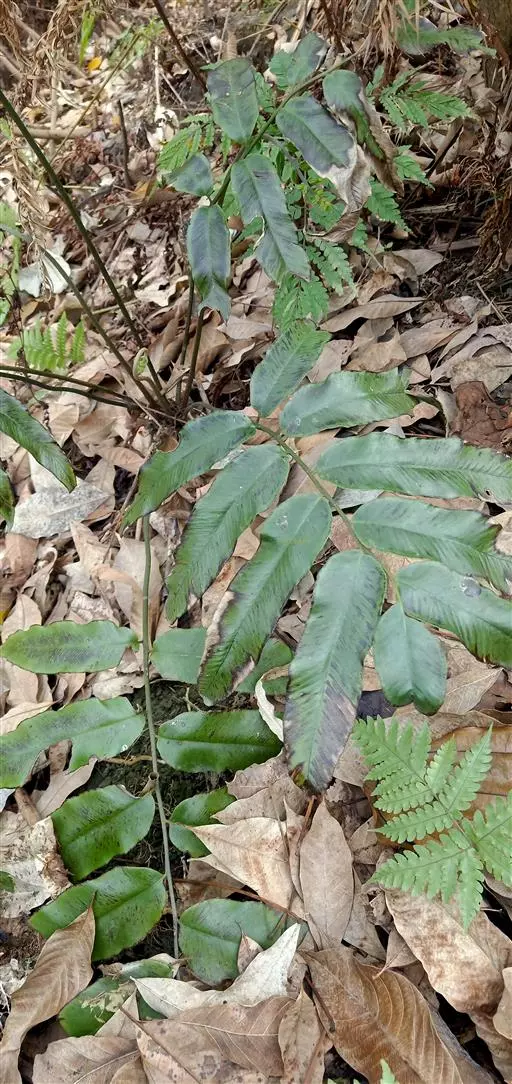 根状茎长而横走或横卧至斜升,直径3-4(-8)毫米,黑色,密生肉质粗根,先端密被鳞片;鳞片披针形,质厚,褐色至黑褐色,边缘有细齿;叶近生或簇生。能育叶长达80厘米;叶柄长25-50枥,直径2-3毫米,禾秆色或褐黄禾秆色,基部褐黑色,密被与根状茎上相同的鳞片,向上渐变光滑,上面有纵沟;叶片椭圆形或卵状椭圆形,长25-40厘米,宽15-25厘米,奇数一回羽状;侧生羽片通常2-5对,同大,近对生或向上互生,斜向上,基部1对有长约2-4毫米的短柄,向上的近无柄,卵状披针形或椭圆形,长 10-20厘米,宽3-5厘米,先端长渐尖,通直或略上弯呈镰形,基部圆楔形或近圆形,边缘下部全缘或微波状,向先端多少有锯齿或圆齿,干后常反卷;中脉下面圆而隆起,上面有浅纵沟;侧生小脉两面明显或上面略可见,斜展或略斜向上,每组有小脉3-5条,纤细,直达叶边。叶近革质或厚纸质,干后灰绿色或褐绿色;叶轴灰褐禾秆色,光滑上面有纵沟。孢子囊群及囊群盖长线形,斜展或略斜向上,通常离中脉向外伸展,达离叶边不远外,少有与小脉等长,每组叶脉有1-3(-4)条,基部上出一脉上的双生,较长,其余的较短,单生于小脉内侧。孢子赤道面观半圆形,周壁透明而稍宽,具少数褶皱,表面具不明显的颗粒状纹饰。