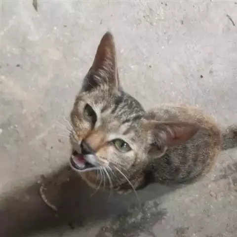 中间脸型,耳位高,耳朵大,眼间距较宽,脑门上有M型虎斑。