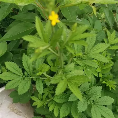 基生叶 为大头羽状复叶,通常有小叶2-6对,连叶柄长10-25厘米,叶柄被粗硬毛,小叶大小极 不相等,顶生小叶最大,菱状广卵形或宽扁圆形,长4-8厘米,宽5-10厘米,顶端急尖或 圆钝,基部宽心形至宽楔形,边缘常浅裂,有不规则粗大锯齿,锯齿急尖或圆钝,两面绿色, 疏生粗硬毛;茎生叶羽状复叶,有时重复分裂,向上小叶逐渐减少,顶生小叶披针形或倒卵 披针形,顶端常渐尖或短渐尖,基部楔形;茎生叶托叶大,绿色,叶状,卵形,边缘有不规则粗大锯齿。