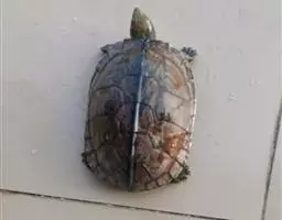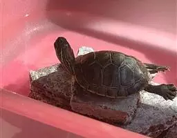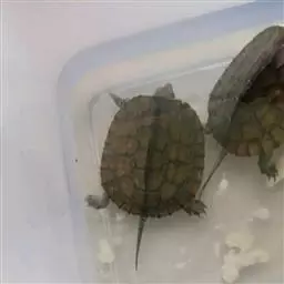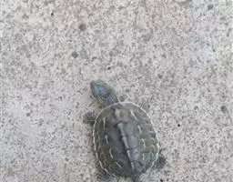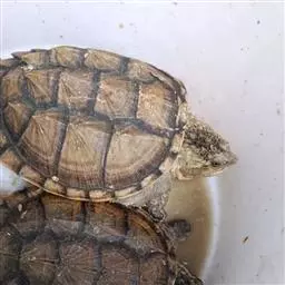 刚孵化的幼龟,背甲棕黑色,具3棱,脊棱明显,其色较浅,侧棱较弱。腹甲黄白色,两腹侧各具一条明显的纵棱;脐孔位于腹盾和股盾间缝的中央部。