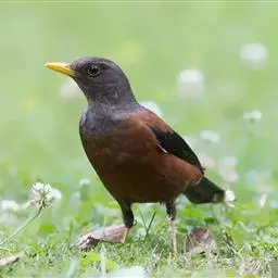 灰头鸫:中型鸟类,体长23-27厘米。整个头、颈和上胸褐灰色,两翅和尾黑色,上、下体羽栗棕色。…