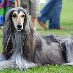 阿富汗猎犬全身披丝绢状的长毛,毛色鲜艳,呈多种颜色,背中线附近毛短,…