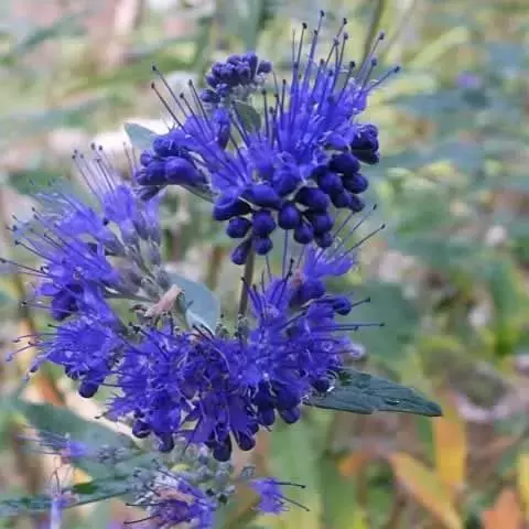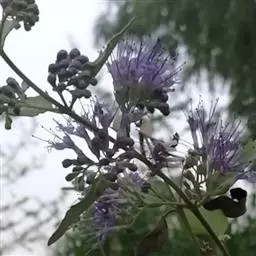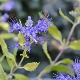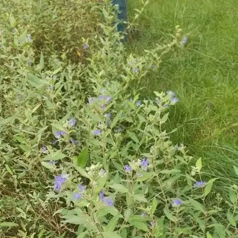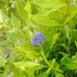 金叶莸是园林培植品种。落叶灌木类,株高50-60厘米,枝条圆柱形。单叶对生,叶长卵形,长3-6厘米,叶端尖,基部圆形,边缘有粗齿。叶面光滑,鹅黄色,叶背具银色毛。聚伞花序紧密,腋生于枝条上部,自下而上开放;花萼钟状,二唇形裂,下萼片大而有细条状裂,雄蕊;花冠、雄蕊、雌蕊均为淡蓝色,花紫色,聚伞花序,腋生,蓝紫色,花期在夏末秋初的少花季节(7-9月),可持续2-3个月。
