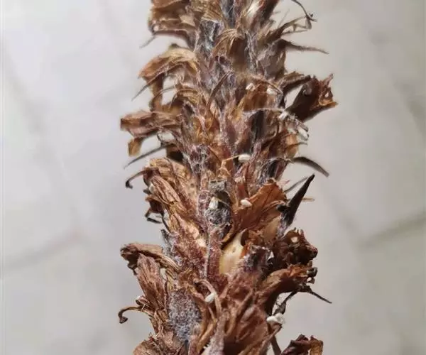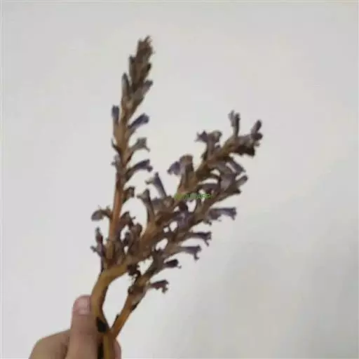 列当 二年0)15-40(-50)厘米,全株密被蛛丝状长绵毛。茎直立,不分枝, 列当 具明显的条纹,基部常稍膨大。叶干后黄褐色,生于茎下部的较密生或多年生寄生草本,株高(-1集,上部的渐变稀疏,卵状披针形,长1.5-2厘米,宽5-7毫米,连同苞片和花萼外面及边缘密被蛛丝状长绵毛。
