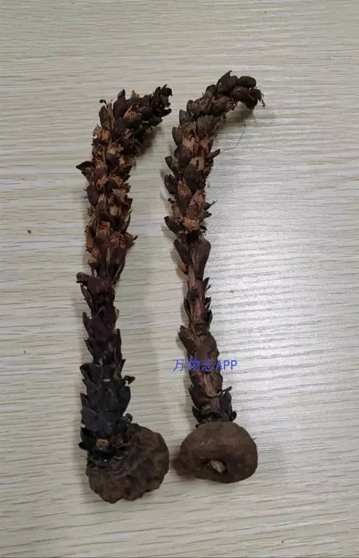 性状鉴别茎肉质,长圆柱形,有时稍扁,略弯曲,长3-15cm 列当 ,直径5-15cm,向上渐细,直径2-5cm,有的切成段,上下直径相近。表面灰棕色或棕褐色,有纵沟,密被覆瓦状排列的肉质鳞叶,鳞叶菱形或三角形,宽0.5-1.5cm,厚约2mm,尚可见鳞叶脱落后留下的弯月形叶迹。质坚实,不易折断。断面棕色,有淡棕色维管束小点,环列成深波状或锯齿状。木部约占4/5,有时中空。表面和断面在光亮处有时可见结晶样小亮点。气微,味甜,略苦。