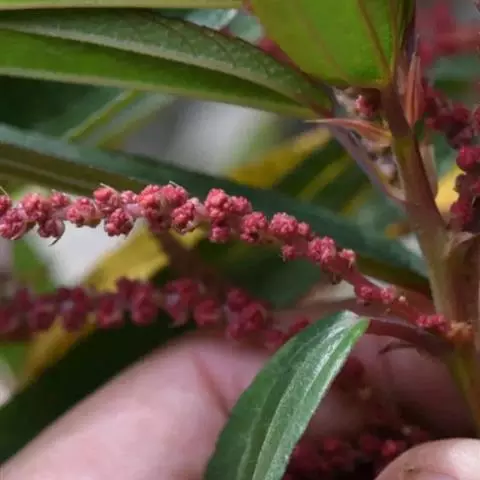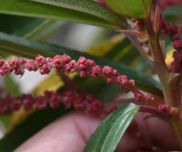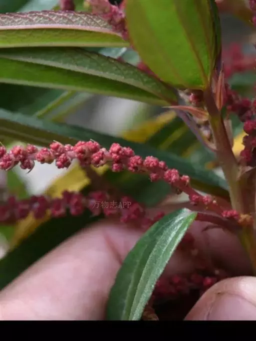 两性花序下部或近基部有少数分枝,稀不分枝,雄性花序分枝,雌性花序不分枝,穗状;雄团伞花序直径约2毫米,雌团伞花序直径2-2.5毫米,互相邻接;苞片狭三角形,长1.2-2毫米。雄花:花被片4,椭圆形,长约1毫米,基部合生,外面疏被短糙伏毛;雄蕊4,花丝长1.6毫米,花药直径0.6毫米;退化雌蕊倒卵球形,长约0.5毫米。雌花:花被纺锤形,狭倒卵形或倒卵形,长约0.7毫米,果期长1-1.3毫米,顶端有2小齿,